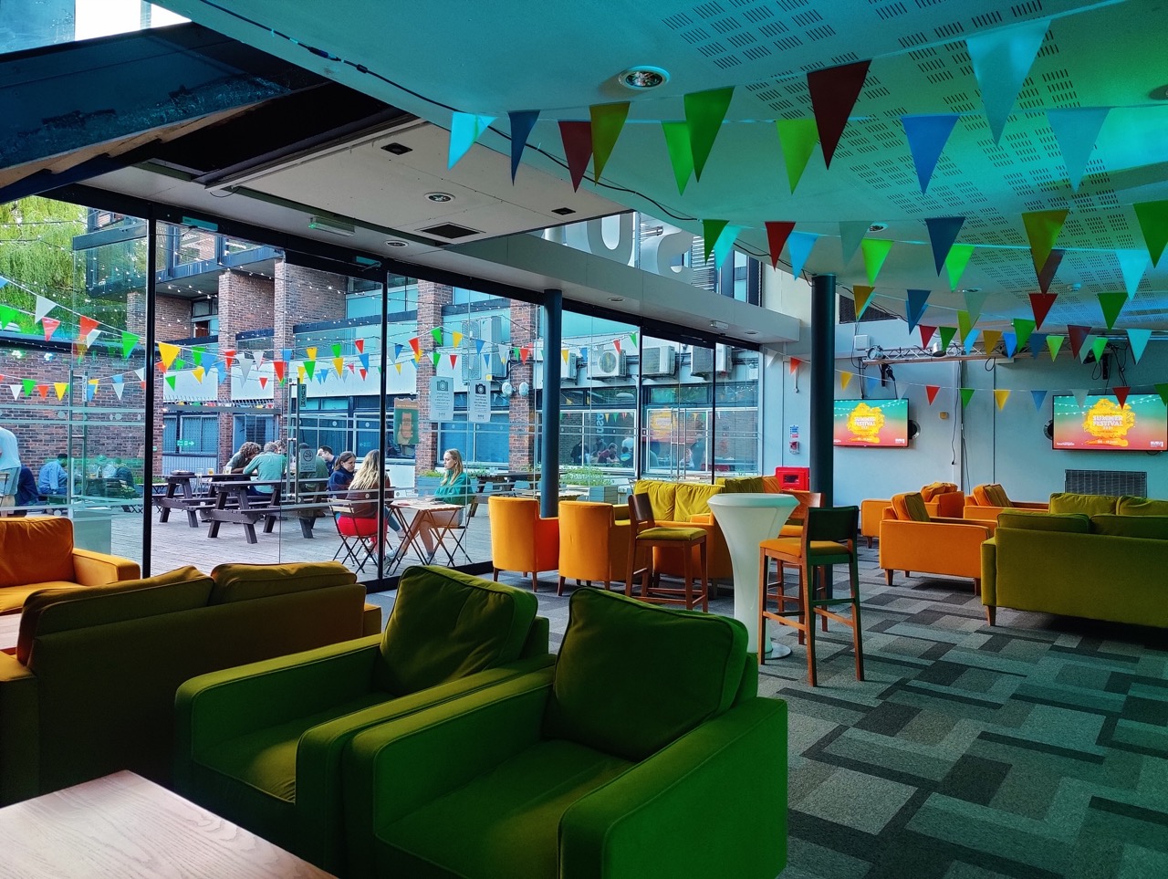 Below Deck is our events bar with an outdoor heated courtyard. Get your drinks here at our events in The Cube, or use the space through the day as the perfect place to relax or study.
