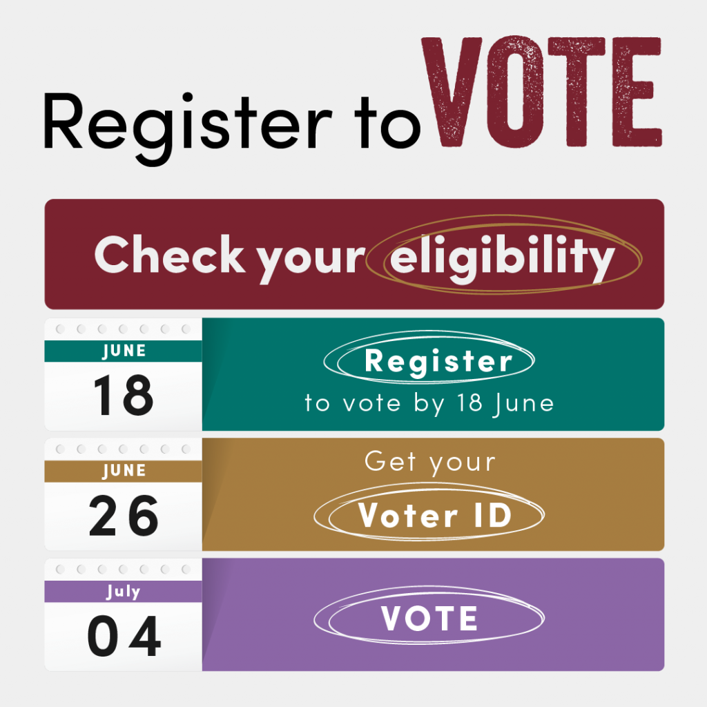 The Government has called a General Election for Thursday 4th July 2024. The last one was held in December 2019 so a lot of our students won’t have been eligible to vote. Students make up 10% of the voting population and with so many key elements of your student experience decided by the UK Government, this is the perfect opportunity to have your voice heard.