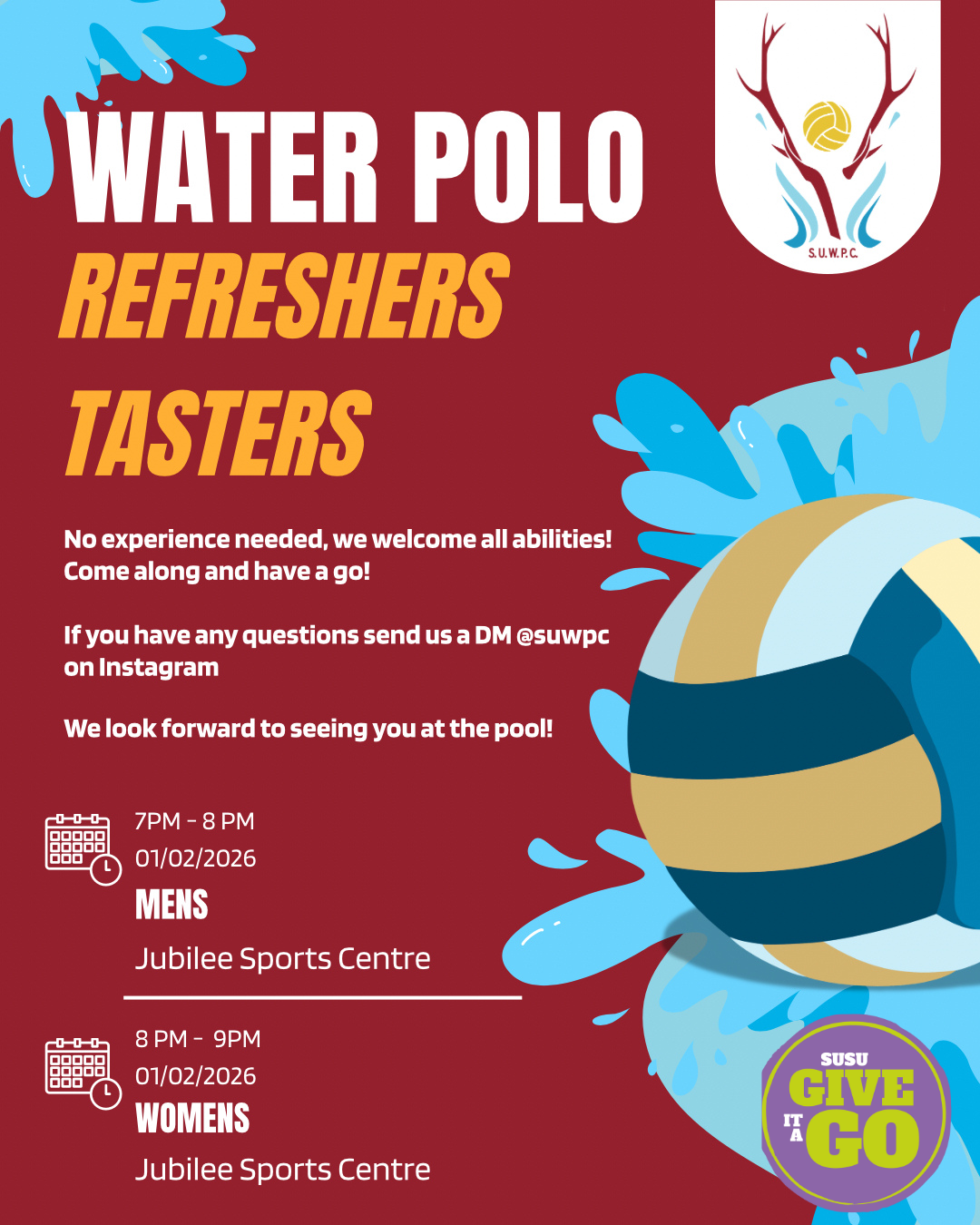 There is also additional 1st team training (those who are eligible will be invited) at these times and locations with Southampton City Water Polo Club: